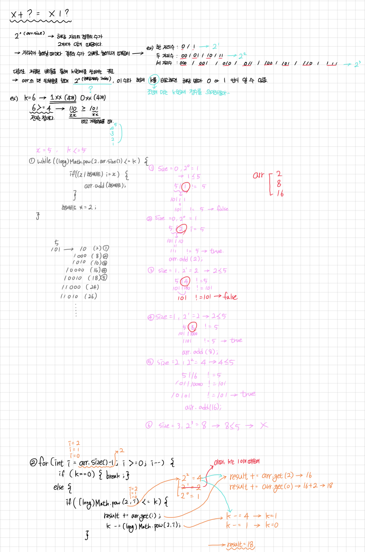 X + Y == X | Y๋ฅผ ์ฐ์ฐ ํ๋ ค๋ฉดX๋ฅผ ์ด์ง์๋ก ๋ณํ ํ์ ๋, 0์ธ ์ธ๋ฑ์ค๊ฐ 1์ธY๊ฐ ์ ์กฐ๊ฑด์ ํด๋นํ๋ค.X๋ฅผ ์ด์ง์๋ก ๋ณํ ํ์ ๋,X์ i ์ธ๋ฑ์ค ๊ฐ($2^n$)๊ฐK๋ณด๋ค ์์ ๊ฒฝ์ฐ๋งํผX์ ์ด์ง์ ๊ฐ์์ 0์ธ ๋ถ๋ถ์ ์ฐพ์์ผ ํ๋ค.- ์ด๋