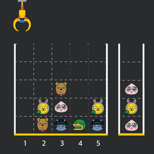 ๊ฒ์ ํ๋ฉด์ 1 x 1 ํฌ๊ธฐ์ ์นธ๋ค๋ก ์ด๋ฃจ์ด์ง N x N ํฌ๊ธฐ์ ์ ์ฌ๊ฐ ๊ฒฉ์์ด๋ฉฐ ์์ชฝ์๋ ํฌ๋ ์ธ์ด ์๊ณ ์ค๋ฅธ์ชฝ์๋ ๋ฐ๊ตฌ๋๊ฐ ์์ต๋๋ค. (์ ๊ทธ๋ฆผ์ 5 x 5 ํฌ๊ธฐ์ ์์์ ๋๋ค). ๊ฐ ๊ฒฉ์ ์นธ์๋ ๋ค์ํ ์ธํ์ด ๋ค์ด ์์ผ๋ฉฐ ์ธํ์ด ์๋ ์นธ์ ๋น์นธ์ ๋๋ค. ๋ชจ๋ ์ธํ์ 1 x 1 ํฌ๊ธฐ์ ๊ฒฉ์ ํ ์นธ์ ์ฐจ์งํ๋ฉฐ ๊ฒฉ์์ ๊ฐ์ฅ ์๋ ์นธ๋ถํฐ ์ฐจ๊ณก์ฐจ๊ณก ์์ฌ ์์ต๋๋ค. ๊ฒ์ ์ฌ์ฉ์๋ ํฌ๋ ์ธ์ ์ข์ฐ๋ก ์์ง์ฌ์ ๋ฉ์ถ ์์น์์ ๊ฐ์ฅ ์์ ์๋ ์ธํ์ ์ง์ด ์ฌ๋ฆด ์ ์์ต๋๋ค. ์ง์ด ์ฌ๋ฆฐ ์ธํ์ ๋ฐ๊ตฌ๋์ ์์ด๊ฒ ๋๋ ๋ฐ, ์ด๋ ๋ฐ๊ตฌ๋์ ๊ฐ์ฅ ์๋ ์นธ๋ถํฐ ์ธํ์ด ์์๋๋ก ์์ด๊ฒ ๋ฉ๋๋ค. ๋ค์ ๊ทธ๋ฆผ์ [1๋ฒ, 5๋ฒ, 3๋ฒ] ์์น์์ ์์๋๋ก ์ธํ์ ์ง์ด ์ฌ๋ ค ๋ฐ๊ตฌ๋์ ๋ด์ ๋ชจ์ต์ ๋๋ค.