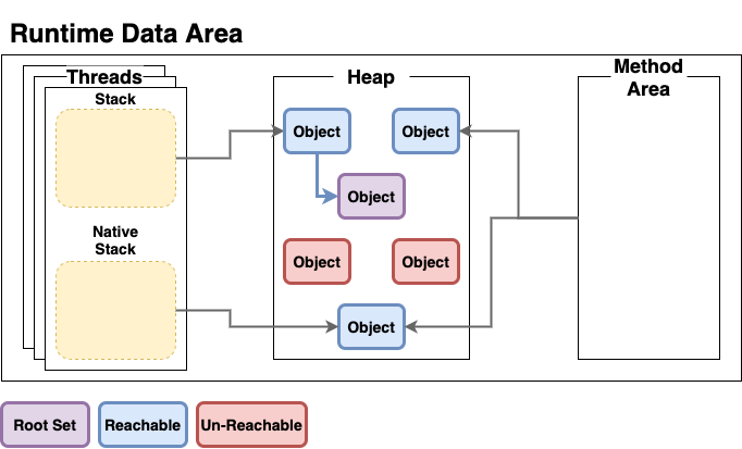 โ๏ธ Root Set ๊ฐ์ฒด๊ฐ ์ฐธ์กฐํ๊ณ ์๋ ์ต์ด์ ๊ฐ์ฒด๋ฅผ ์๋ฏธํ๋ค. Root Set์ ์ฐธ์กฐํ๊ณ ์๋ ๊ฐ์ฒด๋ค์ ์ฐธ์กฐ๊ฐ ์กด์ฌํ์ง ์๋๋ค๋ฉด ํด๋น ๊ฐ์ฒด๋ค๊ณผ Root Set ๊ฐ์ฒด๋ Un-Reachable ๋ก ๊ฐ์ฃผ๋์ด GC์ ์ํด ์ ๋ฆฌ๋๋ค. (21/05/17 hpotter1993๋, ํผ๋๋ฐฑ ๊ฐ์ฌํฉ๋๋ค!)