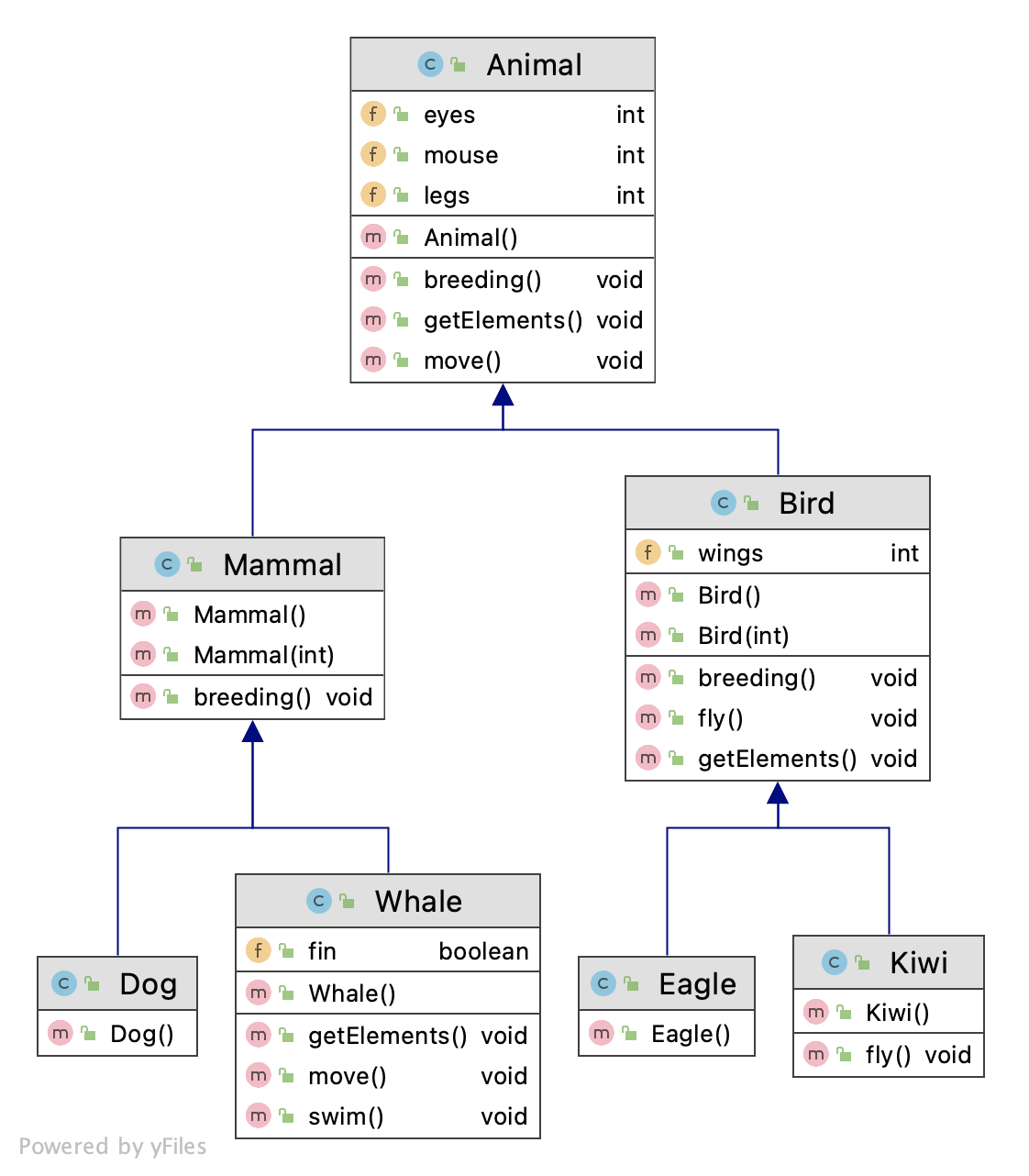 μμ λ€μ΄μ΄κ·Έλ¨μ νμΈν΄λ³΄μ. λ¨Όμ Animal ν΄λμ€κ° μ΅μμ ν΄λμ€λ‘ μ‘΄μ¬νκ³ κ·Έ μλμ Mammal, Bird ν΄λμ€, μ΄ λ ν΄λμ€μ κ°κ° μλμ Dog, Whale, Eagle, Kiwi ν΄λμ€κ° μ‘΄μ¬νλ€. λ€μ΄μ΄κ·Έλ¨μμλ νμ ν΄λμ€λ€μ΄ μμ ν΄λμ€λ₯Ό ν₯ν΄ λ°λΌλ³΄κ³ μλλ° μ΄λ μμμ ννν κ²μ΄λ€.