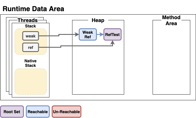 ์์ ์ฝ๋๋ฅผ ๊ทธ๋ฆผ์ผ๋ก ํํํ๋ฉด ๋ค์๊ณผ ๊ฐ๋ค. java.lang.ref์์ ์ ๊ณตํ๋ ํด๋์ค ์ค ํ๋๋ก, ์ฐธ์กฐํ๊ณ ์ ํ๋ ๊ฐ์ฒด๋ฅผ ์บก์ํํด์ ์ ๊ณตํ๊ธฐ ๋๋ฌธ์ Weak Reference๋ ์๋กญ๊ฒ ๋ฉ๋ชจ๋ฆฌ์ ํ ๋น๋๋ฉด Strongly Reachable ํ ๊ฐ์ฒด์ด๋ฉฐ, ๋ง์ฝ ํด๋น ์ฝ๋์ ๋ง์ง๋ง ์ค์ ref ๋ณ์๋ฅผ null๋ก ์ด๊ธฐํํ๋ฉด Weak Reference๋ Weakly Reachableํ ๊ฐ์ฒด๋ก ๋ฐ๋๋ค.