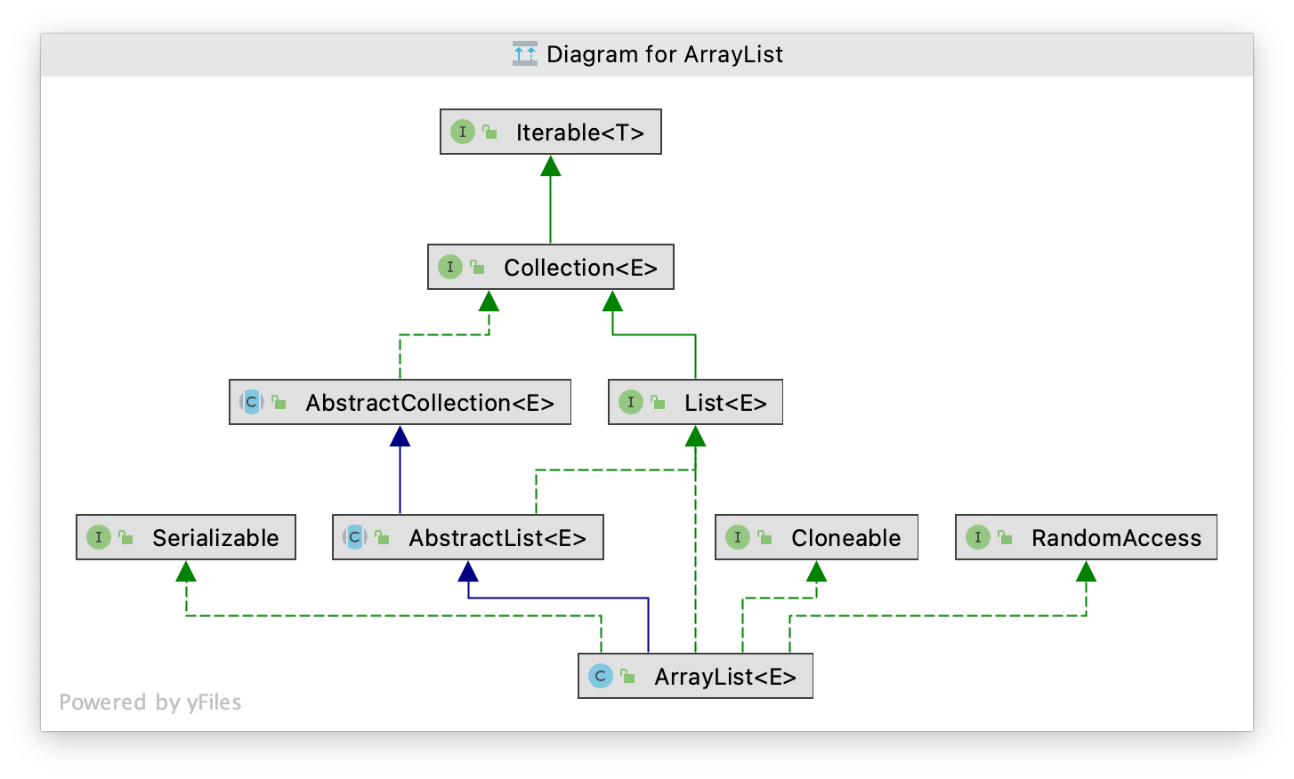 | RandomAccess | implements | ๋ฆฌ์คํธ ๊ฐ์ฒด์ ๋ด๊ธด ๋ฐ์ดํฐ์ ๋น ๋ฅด๊ฒ ์ ๊ทผํ๊ธฐ ์ํด์ ์ง์ ํ๋ค. |