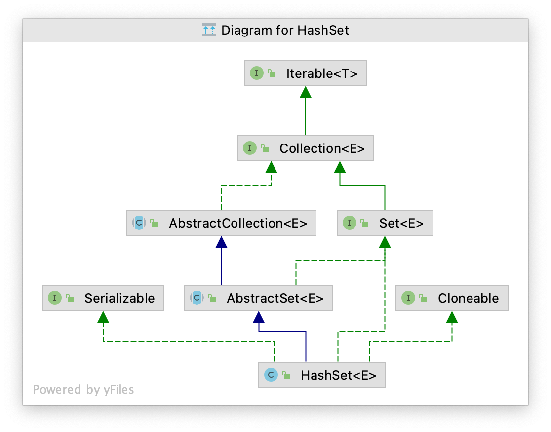 HashSet ํด๋์ค๋ List ์ธํฐํ์ด์ค๋ฅผ ๊ตฌํํ ํด๋์ค์ ๋น์ทํ๊ฒ Serializable, Cloneable ์ธํฐํ์ด์ค๋ฅผ ๊ตฌํํ๊ณ , AbstractSet ํด๋์ค๋ฅผ ํ์ฅํ๋ค.